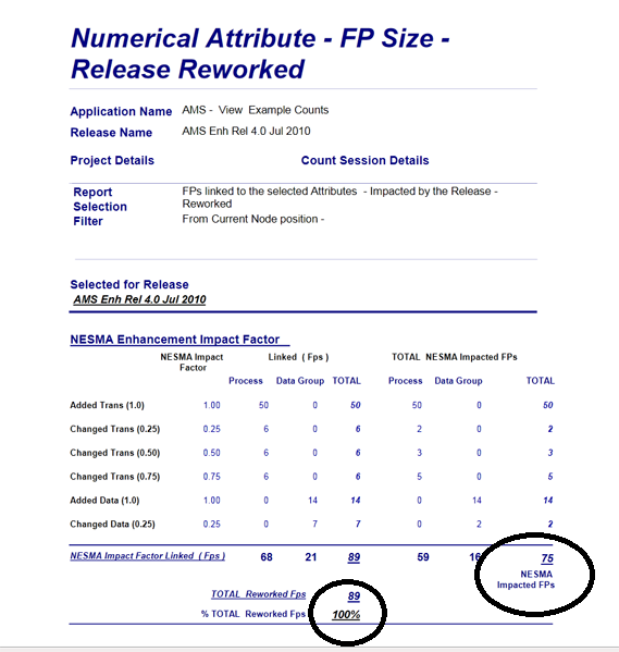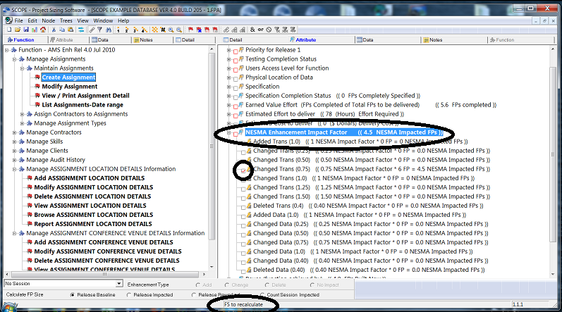 SCOPE enables you to report your Enhancement Function Point Counts using the NESMA method. Assign the Add, Change, Delete Enhancement Types to the Transactions and Data Groups in your functional model as you would normally for an IFPUG function point count. But in addition set up the "NESMA Enhancement Impact Factor " Numerical Attribute category and follow instructions below for assigning the relevant impact factors and reporting the results in NESMA Function Points.